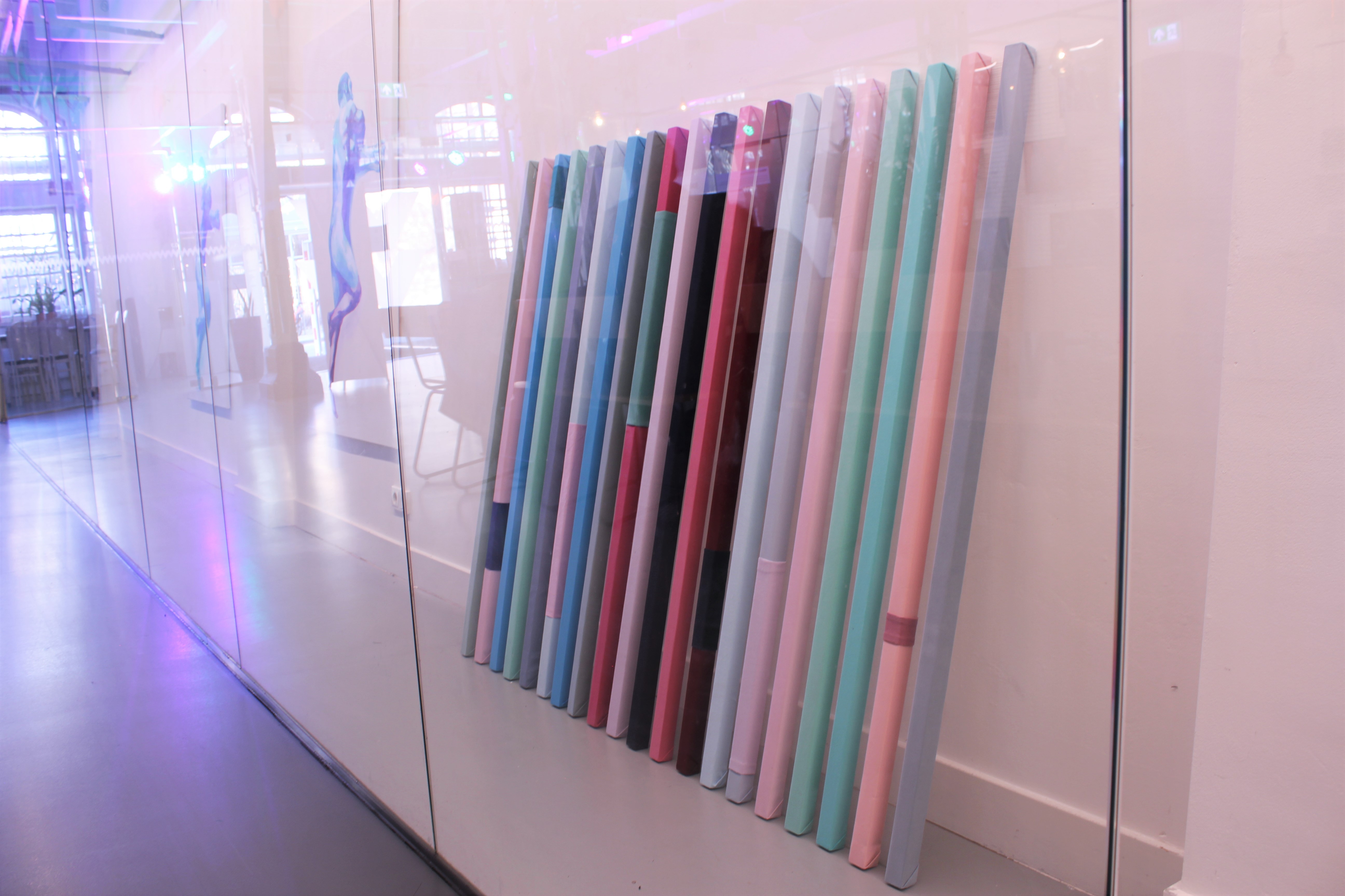 Acrylic on canvas, acrylic on wood, pinewood, textile, anti-slip rug, epoxy resin